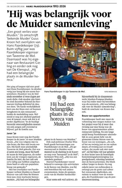 Muiden „Een groot verlies voor Muiden.” Zo omschrijft ’bekende Muider’ Guus Kroon het overlijden van Hans Paardekooper (73). Ruim vijftig jaar was Paardekooper eigenaar van Taveerne de Mol. Daarnaast was hij eigenaar van Restaurant Gieling en eerder ook nog van De Klensput. „Hij had een belangrijke plaats in de Muider horeca.”